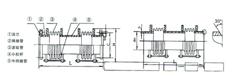 橫向小拉桿波紋補償器由兩段波紋管、中間接管及帶有限螺母的小拉桿等零件組成,它在吸收管系任意平面內的橫向位移,同時吸收軸向位移。小拉桿不能承受內壓推力。